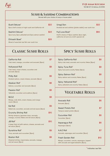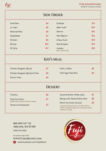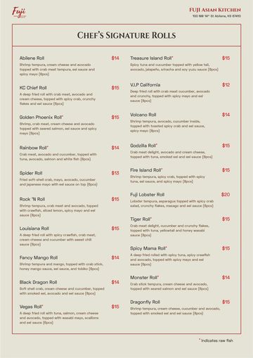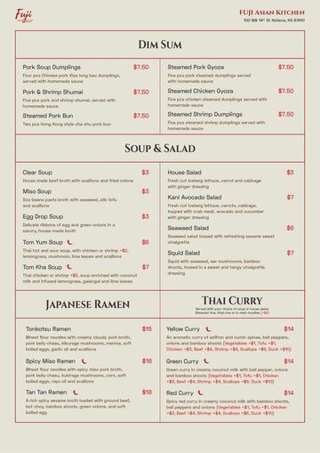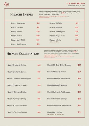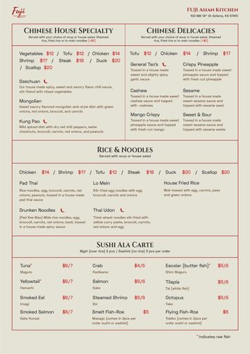 Experience the vibrant flavors of Asia in every bite. From handcrafted sushi and rich ramen to bold Thai curries, sizzling hibachi grills and savory Chinese stir-fries, Fuji Asian Kitchen brings together the best of Asian cuisine in one unforgettable dining experience.